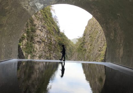 清津峡に行ってきました 足湯の湯面に映る天井 思わず宇宙に吸い込まれそう こんな疑似体験の設計をやってみたいな…