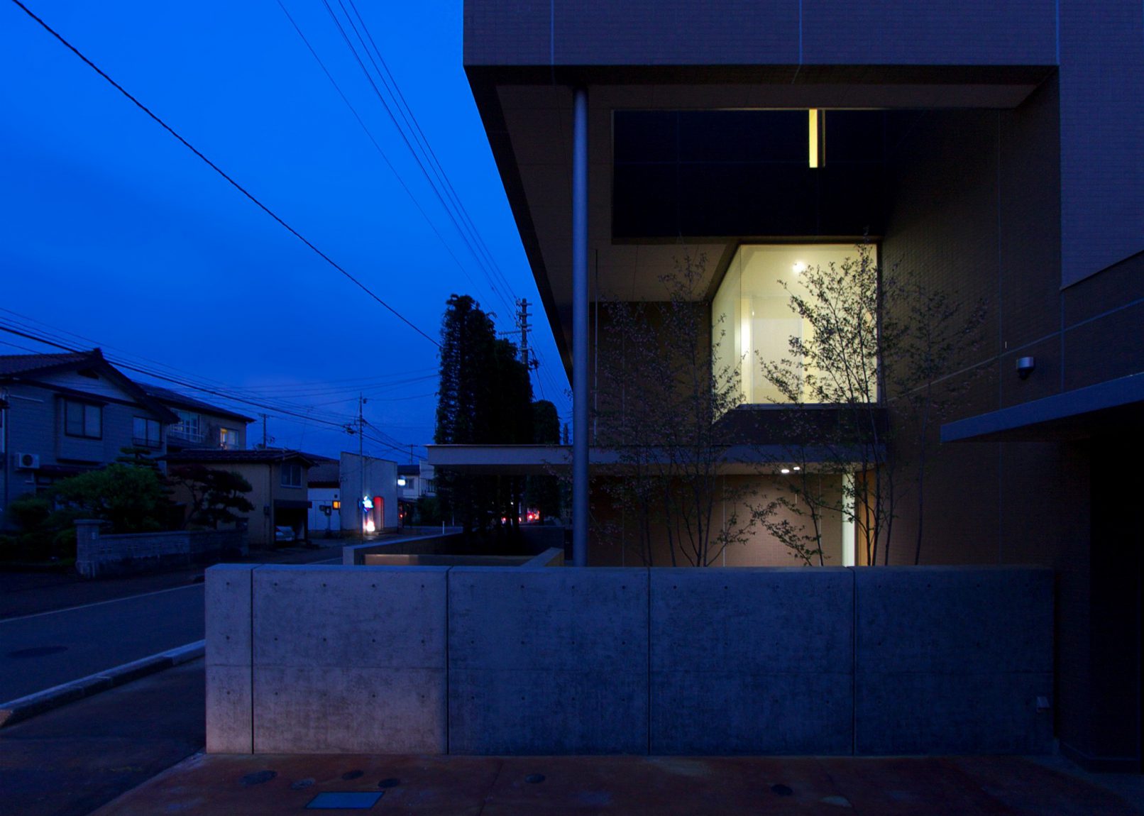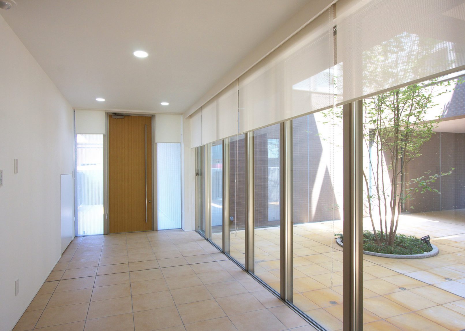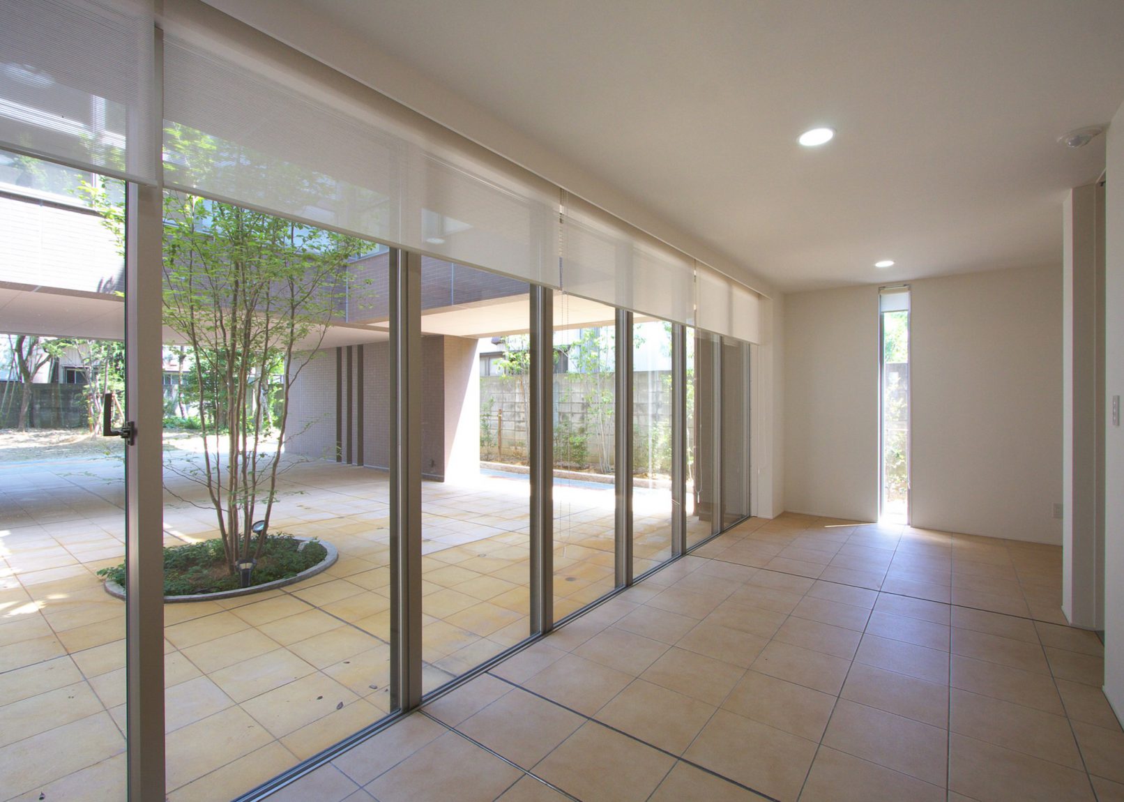 この敷地は住宅街にある。外部に閉じ内部に開く中庭をもつ建物である。中庭から光・緑・風を感じる空間とした。