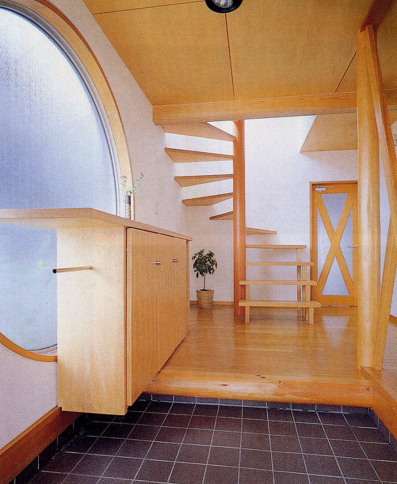 西側の玄関には大きな円窓を設け、そして玄関収納を水平線に見立て沈む夕日をイメージした。