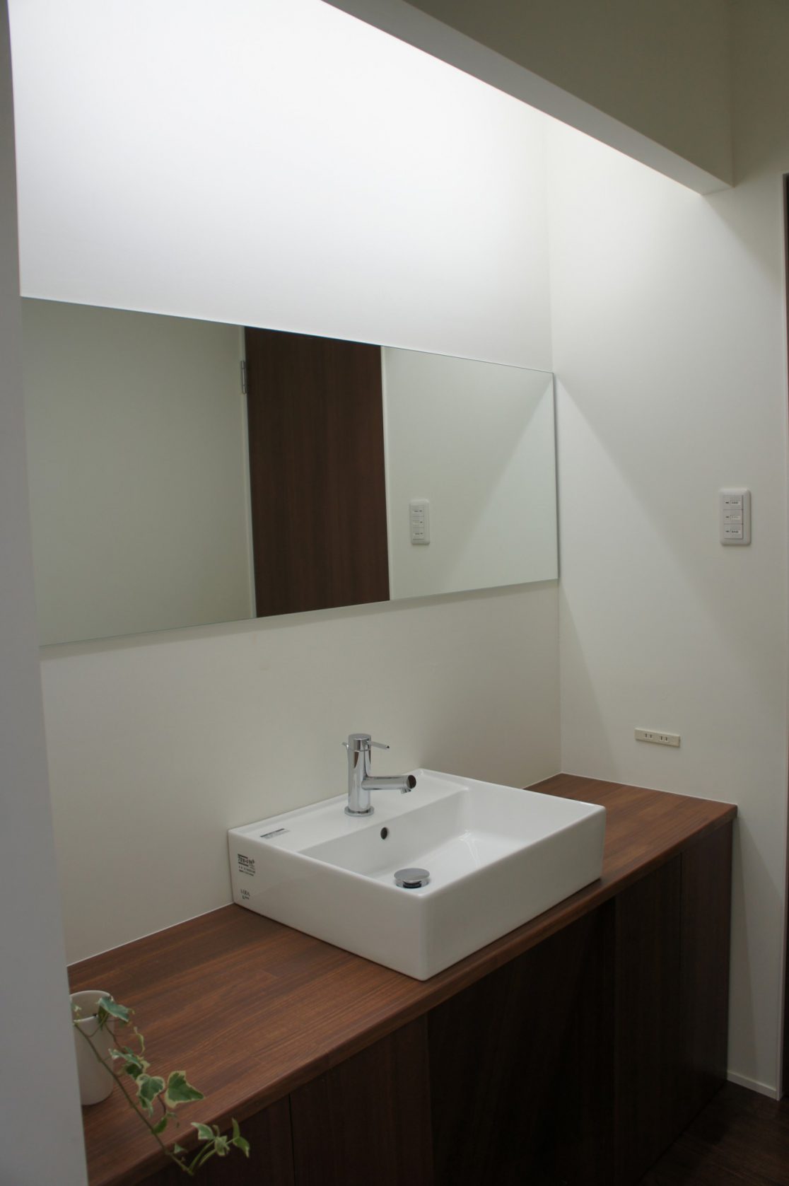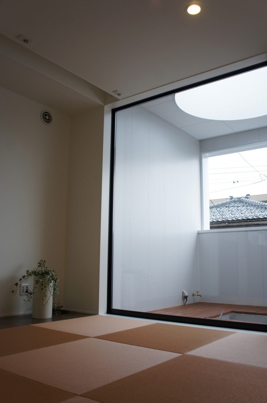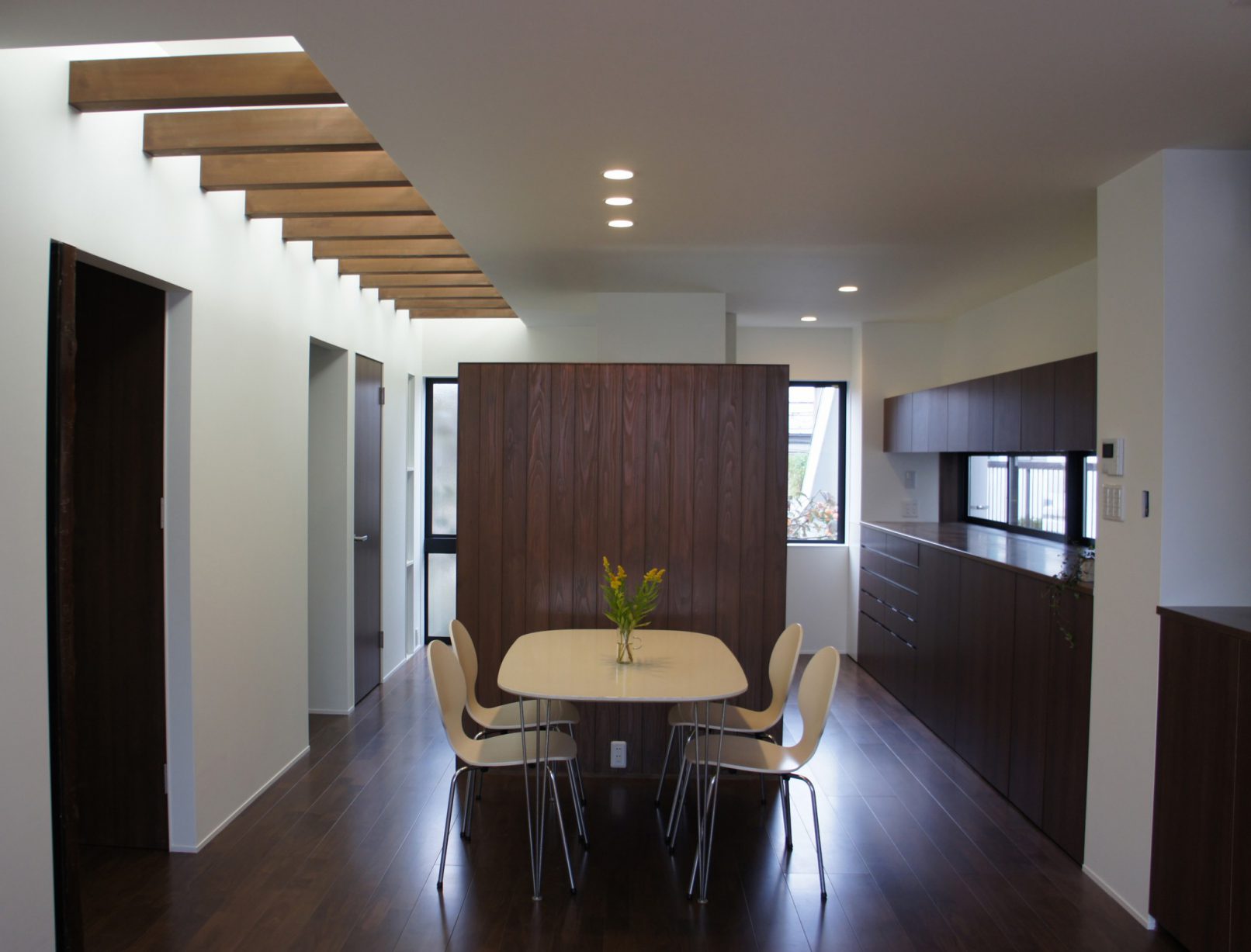 リビング、食堂、台所を一体空間とし、かつ円形に切り取られた吹抜けからは光と緑が感じられる。